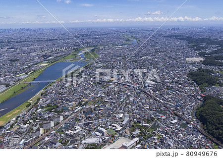 郊外の住宅地から都心を望む・京王稲田堤上空周辺・空撮
