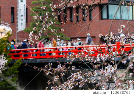 春の高山祭り 屋台と赤橋と満開の桜 飛騨高山 4月