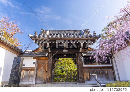 京都 上品蓮台寺 山門から見える玄関前の満開の枝垂れ桜