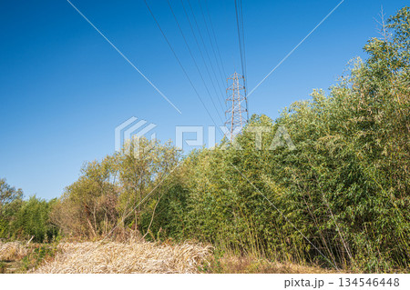 桂川に架かる東海道線鉄橋と河川敷に広がる野菜畑 京都市