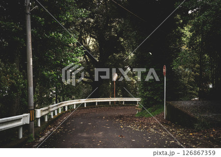 静けさに包まれた山道のカーブと古びたカーブミラー