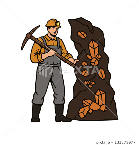 Miner with pickaxe extracting crystals from rocky wall in mining environment vector illustration