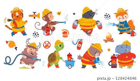 Fireman animals. Cute cartoon animal hold emergency hose and buckets, fire extinguisher, hydrant elements. Rescue team nowaday vector clipart