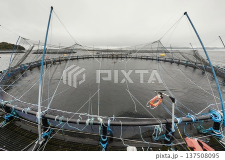 Large fish farm in the water with nets under cloudy sky as background
