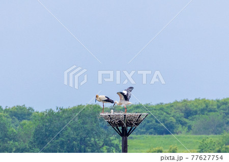 兵庫県豊岡市にあるコウノトリの郷公園にある人工巣塔で放卵するコウノトリ