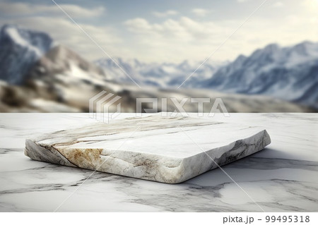 Empry marble stone podium with mountains on background. Empty background for product presentation, mockup. Generative Ai image