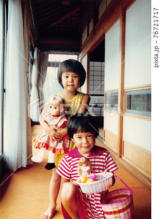 昔のフィルム写真 家の廊下で人形ごっこをして遊ぶ二人の女の子の姉妹