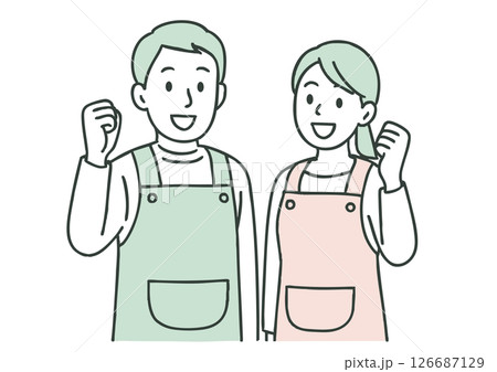 明るい笑顔のエプロン姿の男性がカメラ目線で立つ爽やかな室内ポートレート