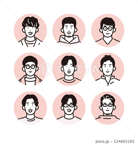 シンプル イラスト 笑顔のカジュアルな服装の男性のアイコンセット 人物