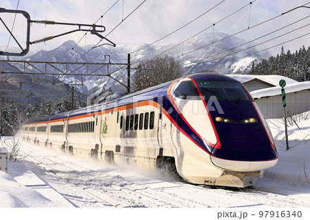 冬の板谷峠を越える山形新幹線と吾妻連峰