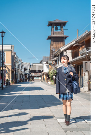 古い街並みを通学する女子中学生