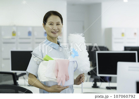 オフィスで清掃道具を持って立つシニア女性のポートレート