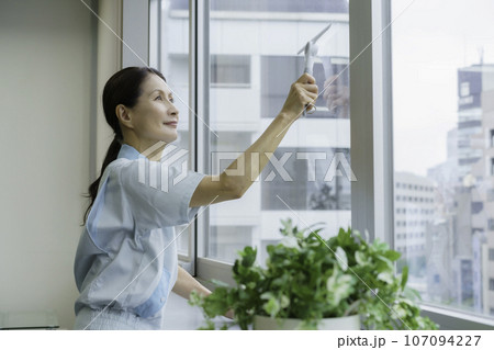 オフィスで窓の掃除をするシニア女性清掃員のポートレート