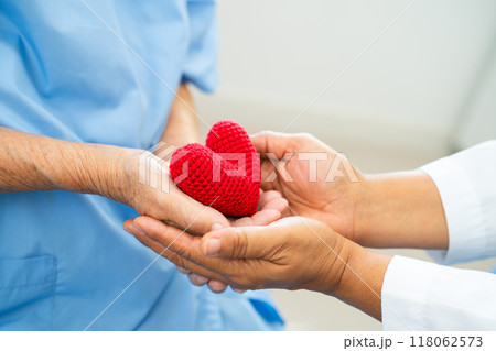 Asian doctor give red heart to elderly woman in her hand, heart Attack.