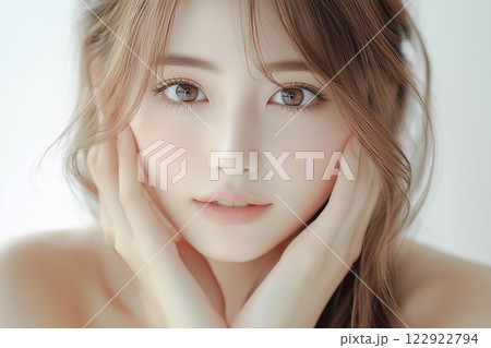 肌がキレイな若い日本人女性。美容、ビューティー、健康、スキンケア、化粧品の広告デザインに最適な人物