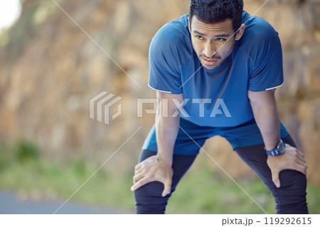 Asian man, exercise and tired or outdoor fatigue on mountain, training or healthy. Male person, knees and nature for running wellness with fitness routine or athlete sports, burnout or performance