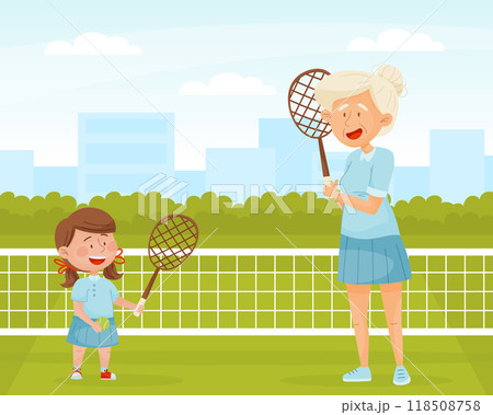 Senior Woman Character Play Badminton with Little Granddaughter Vector Illustration