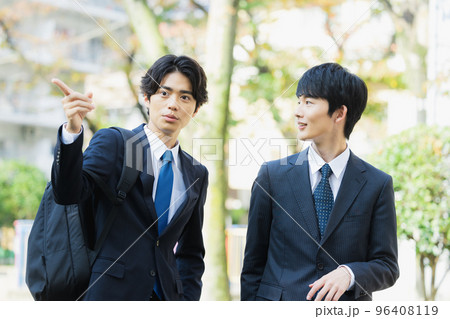 緑の自然あふれる公園に立つ爽やかなビジネスマン