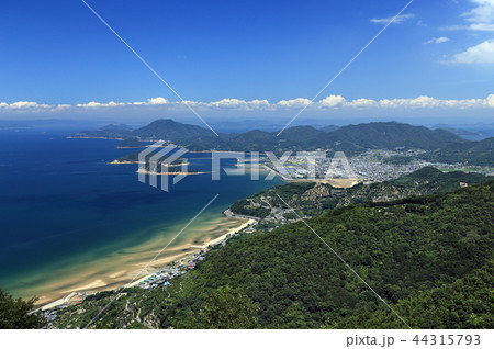 香川県三豊市のサンビーチ(父母ヶ浜南隣)、蔦島と仁尾の町、荘内半島(右奥に塩飽諸島)