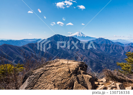 道志山塊の道志山稜縦走コース 赤鞍ヶ岳のウバガ岩より富士山と道志山稜を望む