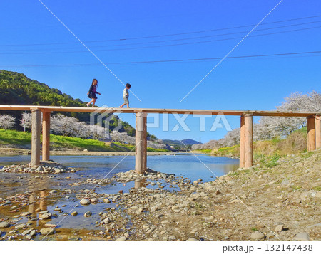 福岡県みやこ町の桜や菜の花が咲く今川に架かる沈下橋