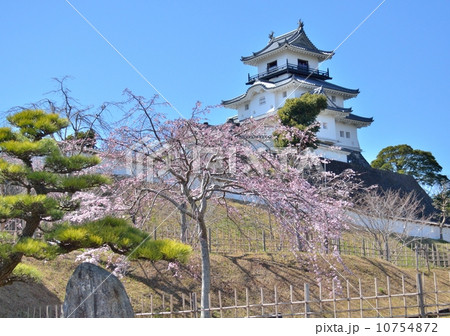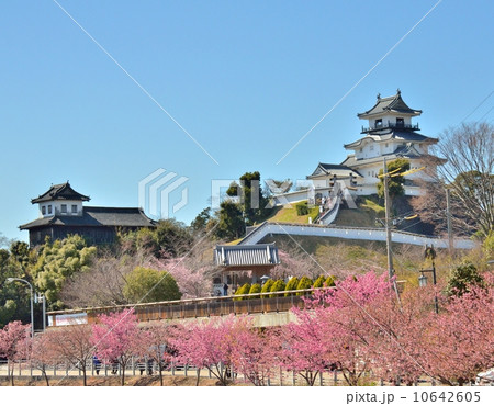 春の日の掛川城と掛川桜(静岡県掛川市)