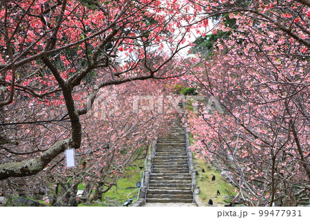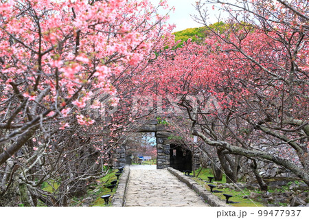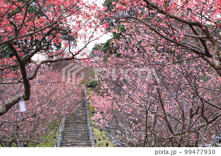 世界遺産 今帰仁城跡 満開のカンヒザクラ