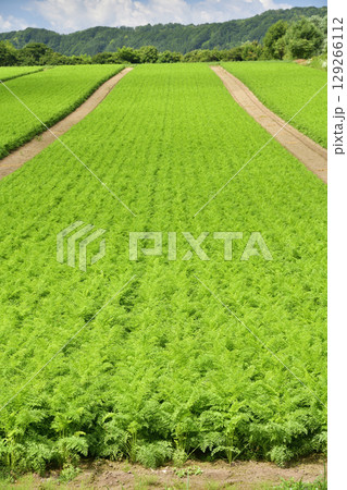真夏の北海道今金町で青々と茂った大豆畑の風景を撮影