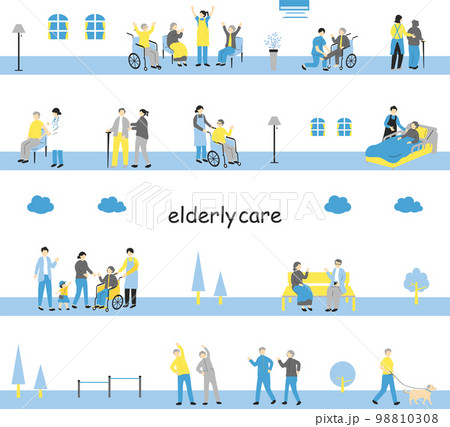 シニアの日常生活と介護シーンの人物イラストセット(高齢者・外出・散歩・車椅子)