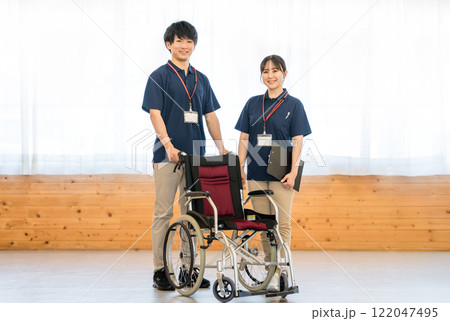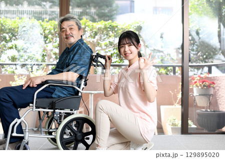 車椅子に乗る高齢者男性と若い女性の介護士
