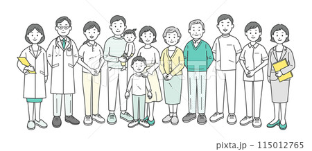 高齢者夫婦と家族と医師と看護師と介護士とケアマネージャー栄養士が集合した全身イラスト