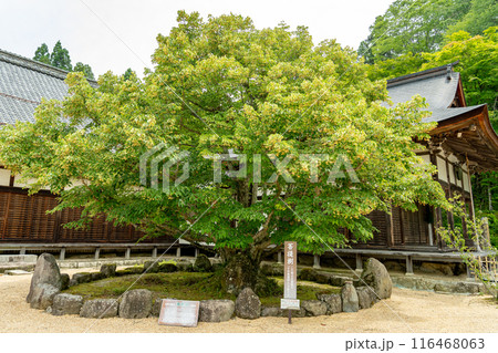 滋賀県東近江市 百済寺の境内で満開を迎え良い香りを放っている本堂前の千年菩提樹の木