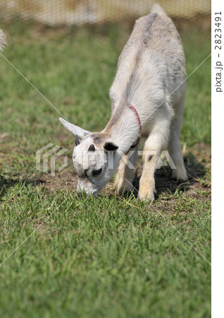 草を食べる赤ちゃんヤギのアップ(ヤクシマヤギ)秩父高原牧場・彩の国ふれあい牧場・埼玉県