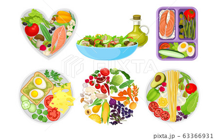Healthy Food Served on Circle and Heart Shaped Plates Top View Vector Set
