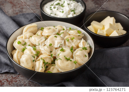 Homemade Meat Dumplings or Pelmeni with fresh parsley on plate close-up. Horizontal