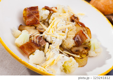 Baked potatoes with cauliflower, bacon, cheese sauce