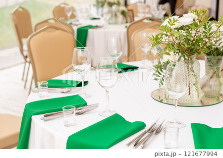 Close up of wine glasses, silver tableware and green napkins on round tables covered with white tablecloth.