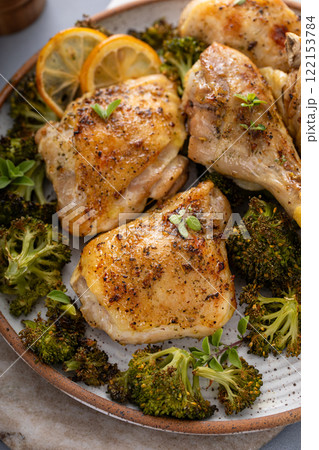 Chicken drumsticks and thighs with broccoli roasted on a serving plate for dinner or lunch