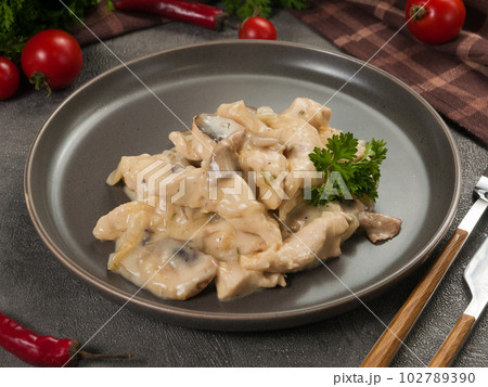 gentle chicken fricassee in cream with mushrooms
