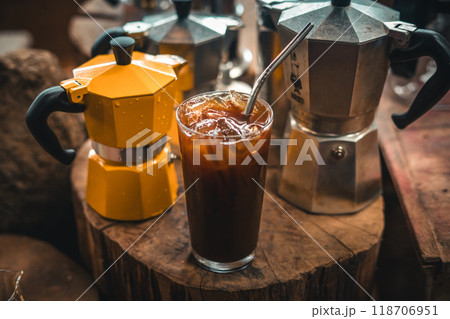 Iced coffee in a glass placed on a wooden table