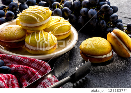 Homemade round lemon cookies. French sweet yellow cookies macarons.