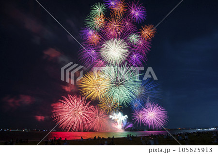 夜空に咲く大輪の花 津花火大会 打ち上げ花火 カラフルな花火 三重の花火大会 海上花火