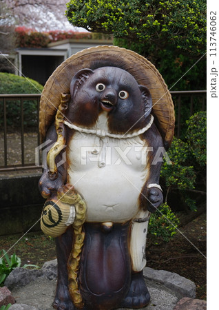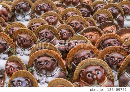 [東京・堀切] タヌキの微笑む顔を描いた信楽焼の陶器のクローズアップ。