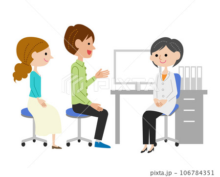 診察室で女医に説明する若い夫婦