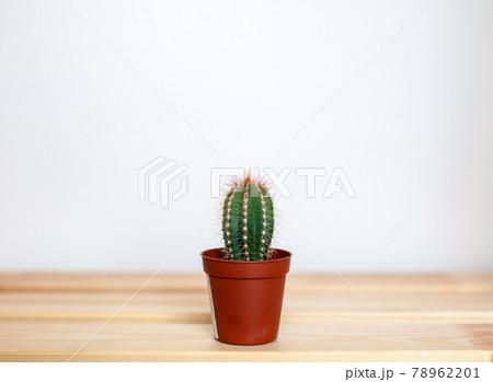 A small cactus in a brown pot on a wooden table. Home interior design