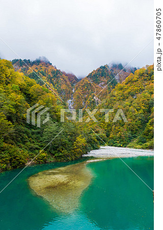 黒部渓谷下ノ廊下の紅葉に映える渓谷と吊り橋