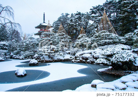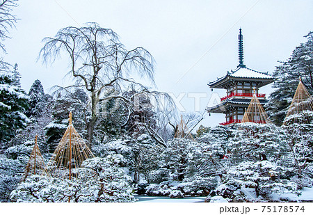 仙台 北山 輪王寺の日本庭園 三重塔と雪吊り