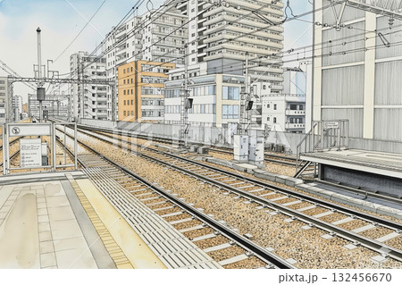 京王線 水彩画 ペン画 新宿行き 府中駅 府中駅ホーム 各駅停車