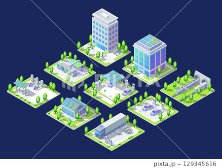 Cartoon Color Different Types Building, Vehicle and Charging Station Electric City Transportation Concept 3d Isometric View . Vector illustration