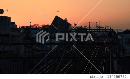 世田谷区立の公園「代田富士356広場」から見た富士山の夕景と小田急の複々線線路